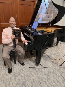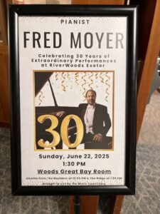 Most of my concert activity is at retirement communities. Many of these places I have played many times, developing wonderful friendships with residents, who share with me their incredible experiences and achievements. While lower-paying than “public” concerts, ironically these concerts are artistically more satisfying. I can try out new programming ideas, play what is hot that day in my fingers, subtly change programs until they “work”, all not possible with the sent-far-in-advance programs. (Imagine a comedian or jazz musician having to send a program 6 months in advance!) Not only are the concerts better, but I can do more of them. So far, since 1994, when I decided to go this route, I have played 7343 concerts — all of them sit-down concerts (not background music or dance music or anything like that.) I often wonder if this isn’t a record of some sort. Three days ago, I played my 34th concert at RiverWoods Exeter. They presented me with a plaque for “30 years of extraordinary performances.”